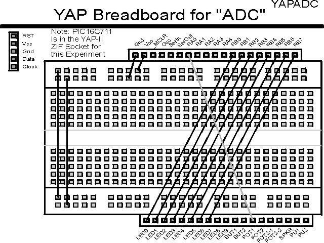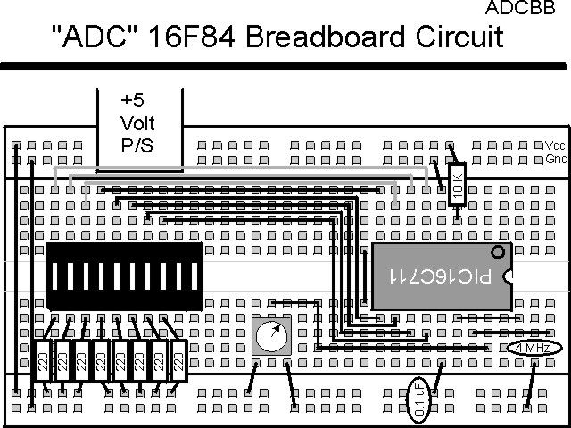 "ADC" ExperimentThe most practical method of reading using an ADC built into a PICmicro® MCU. In this experiment, I have repeated the previous (ADCLess) experiment but I use the built in ADC of a PIC16C711 instead of the characteristics of the digital I/O pins.