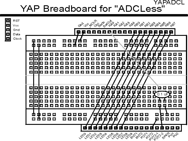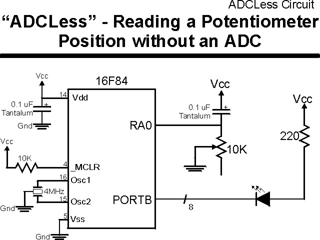 "ADCLess" ExperimentThis experiment demonstrates how the digital I/O pins of the PICmicro can be used to "read" the position of a potentiometer. The original design for this application comes from the Parallax Basic Stamp 2.