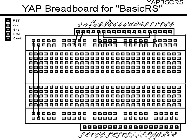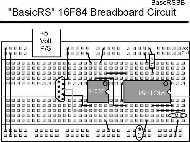"BasicRS" ExperimentThe second RS-232 interface application uses a PICmicro device which does not have a built in RS-232 port and does not use a negative voltage generator (the MAX232 in TrueRS). This experiment is really more typical of the kind of PICmicro applications you will be working with.