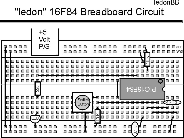 "LEDOn" ExperimentThis is the first experiment where a PICmicro® MCU is actually programmed and run. This experiment simply waits for a button to be pressed and turns on an LED. The circuit is: