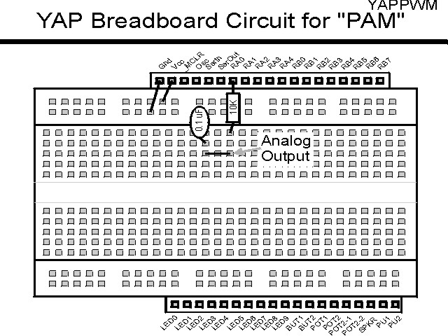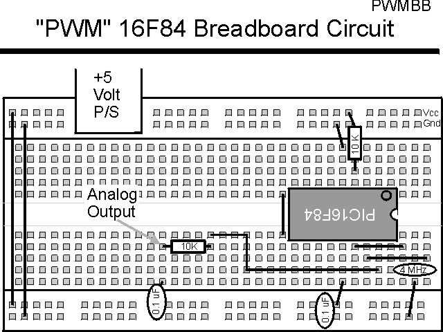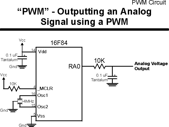 "PWMOut" ExperimentThe second method of outputting an analog voltage is to send a PWM signal into a low-pass filter. The advantages of this method over the voltage ladder is the ability to have much better granularity on the output and the circuit is much simpler. The downside is the extra cycles required by the PICmicro® MCU to control the PWM output (although this could be reduced by using the CCP hardware available in some PICmicro MCU part numbers).