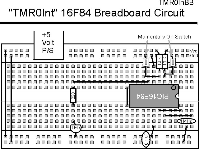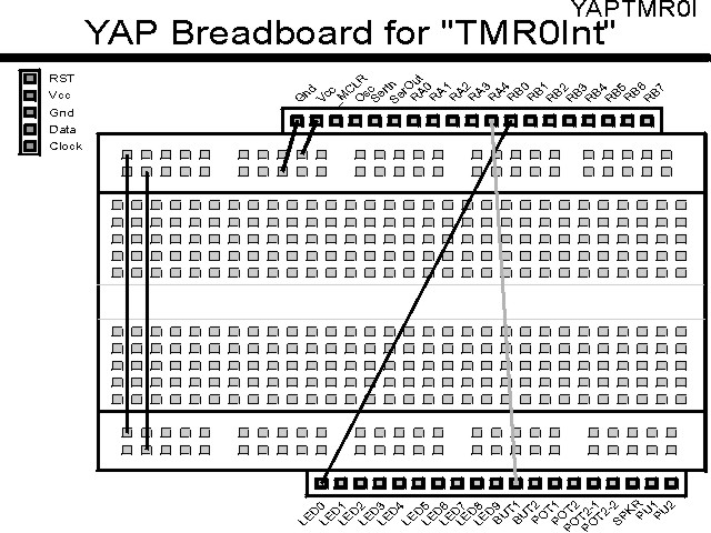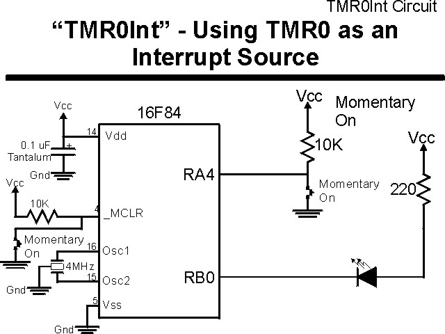 "TMR0Int" ExperimentI always like looking at something from a different perspective. The genesis of this experiment was a question that was asked on the PICList; could you set up TMR0 so that the next detected edge causes an interrupt? The answer to that is yes, and it is demonstrated in this experiment.