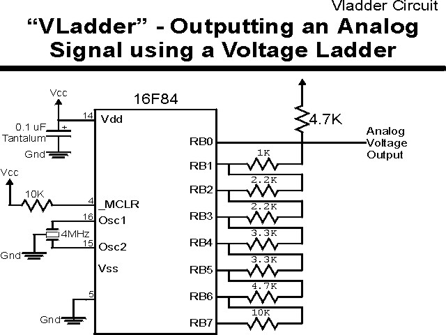 "VLadder" ExperimentDriving out analog voltages from the PICmicro is not a trivial task. In this and the next experiment, I present some ways of implementing the function. Both methods can only supply a low amount of current - for high current loads (more than 1 mA), a voltage following buffer will have to be used to output the analog voltages at higer currents.
