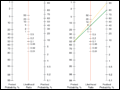 | Figure 3-2 Nomogram version of Bayes' theorem used to predict the posttest probability of disease (right-hand scale) using the pretest probability of disease (left-hand scale) and the likelihood ratio for a positive test (middle scale). See text for information on calculation of likelihood ratios. To use, place a straightedge connecting the pretest probability and... | |