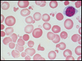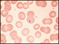 | Figure 57-5 Macrocytosis. Red cells are larger than a small lymphocyte and well hemoglobinized. Often macrocytes are oval shaped (macro-ovalocytes). | |
