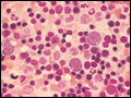 | Figure 57-16 Myeloid hyperplasia. This marrow shows an increase in the fraction of cells in the myeloid or granulocytic lineage as might be seen in a normal marrow responding to infection. The M/E ratio is >3:1. M/E, myeloid/erythroid. (From Hillman et al.) | |
