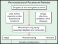 | Figure 261-1 Proposed mechanism for the pathogenesis of pulmonary fibrosis. The lung is naturally exposed to repetitive injury from a variety of exogenous and endogenous stimuli. Several local and systemic factors (e.g., fibroblasts, circulating fibrocytes, chemokines, growth factors, and clotting... | |