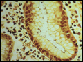 | Figure 293-14 Chronic gastritis and H. pylori organisms. Steiner silver stain of superficial gastric mucosa, showing abundant darkly stained microorganisms layered over the apical portion of the surface epithelium. Note that there is no tissue invasion. | |