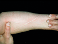 | Figure 317-3 Dermographic urticarial lesion induced by stroking the forearm lightly with the edge of a tongue blade. The photograph, taken after 2 minutes, demonstrates a prominent wheal and flare reaction in the shape of an X. (Photograph provided by Allen P. Kaplan, MD, Medical... | |
