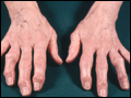 | Figure 332-2 Severe osteoarthritis of the hands affecting the distal interphalangeal joints (Heberden's nodes) and the proximal interphalangeal joints (Bouchard's nodes). There is no clear bony enlargement of the other common site in the hands, the thumb base. | |