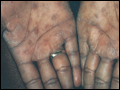 | Figure e16-46 Secondary syphilis commonly affects the palms and soles with scaling, firm, red-brown papules. (Courtesy of Alvin Solomon, MD; with permission.) | |