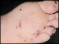 | Figure e16-43 Rocky Mountain spotted fever demonstrating pinpoint petechial lesions on the palm and volar aspect of the wrist. (Courtesy of Robert Swerlick, MD; with permission.) | |