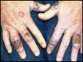 | Figure e16-78 Pyoderma gangrenosum on the dorsal aspect of both hands demonstrating multiple necrotic ulcers surrounded by a violaceous and undermined border. (Courtesy of Robert Swerlick, MD; with permission.) | |